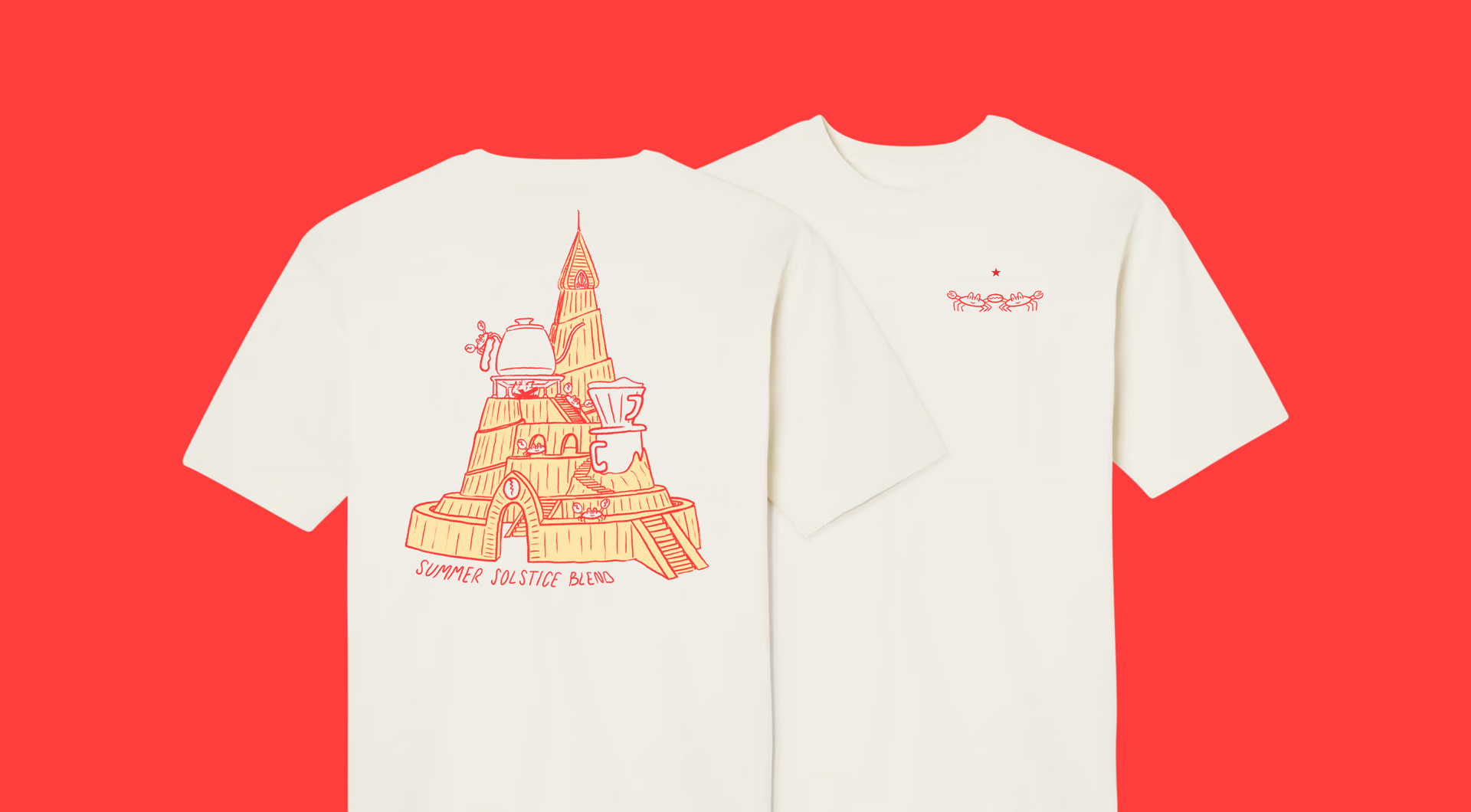 Taking inspiration from a summer beach day, I created a shirt that depicts a family of crabs who aren’t so crabby now that they have figured out a way to brew Intelligentsia’s Summer Solstice Blend from the comfort of their own sandcastle.