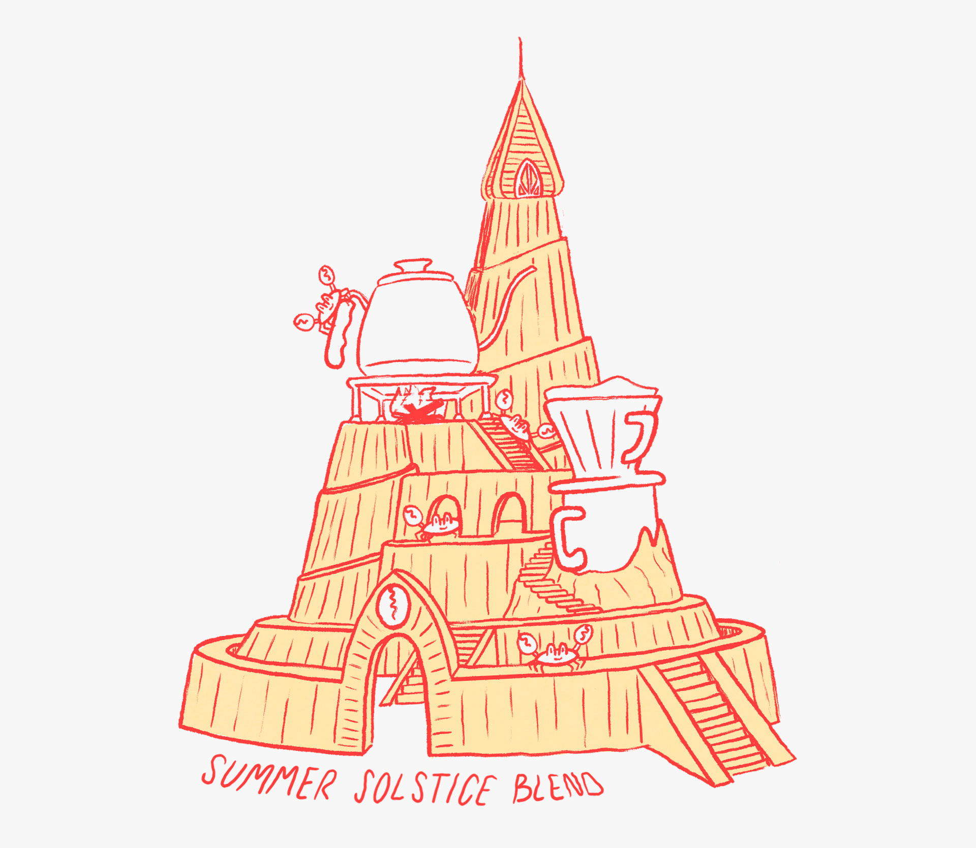 Sandcastle illustration depicting a colony of crabs who have successfully engineered a way to make pour over Intelligentsia for the summer solstice.